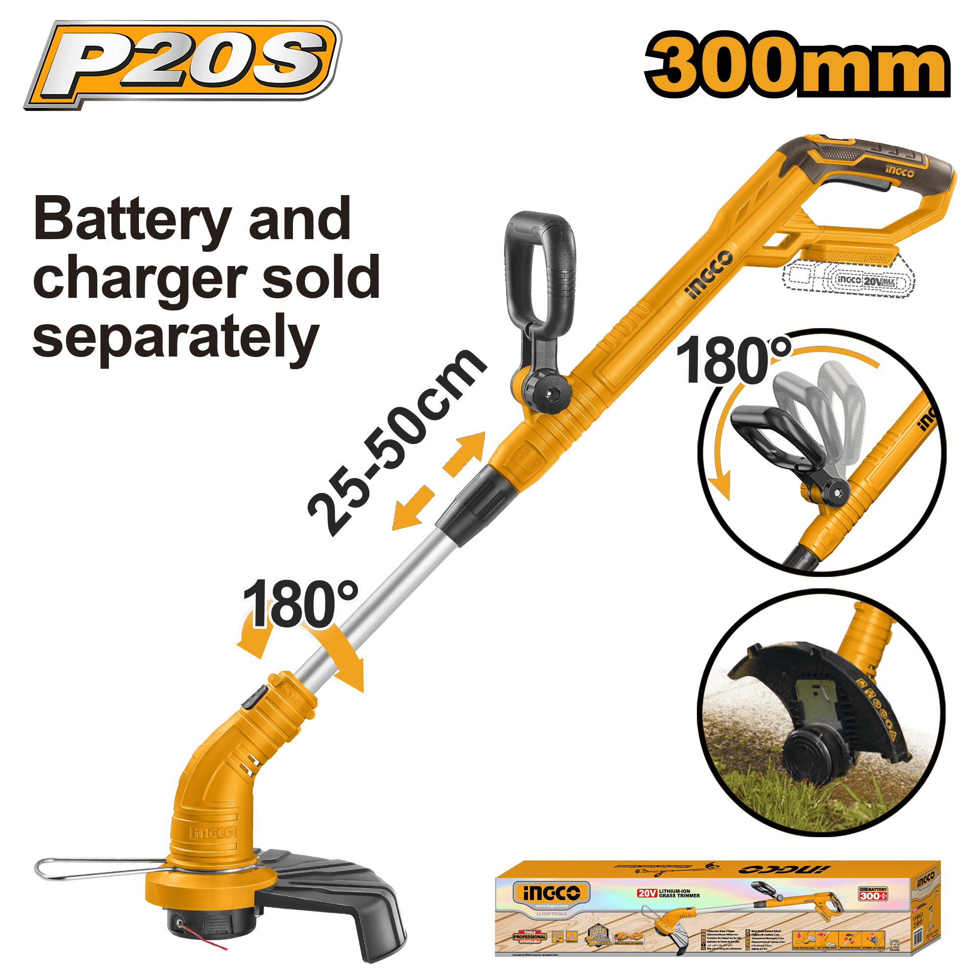 Débroussailleuse sans fil 20 V, moteur à balais, vitesse à vide 8200 tr/min, diamètre de coupe 300 mm, ligne de coupe 1,6 mm, longueur de ligne 5 m, fonction de bordure, batterie et chargeur vendus séparément.