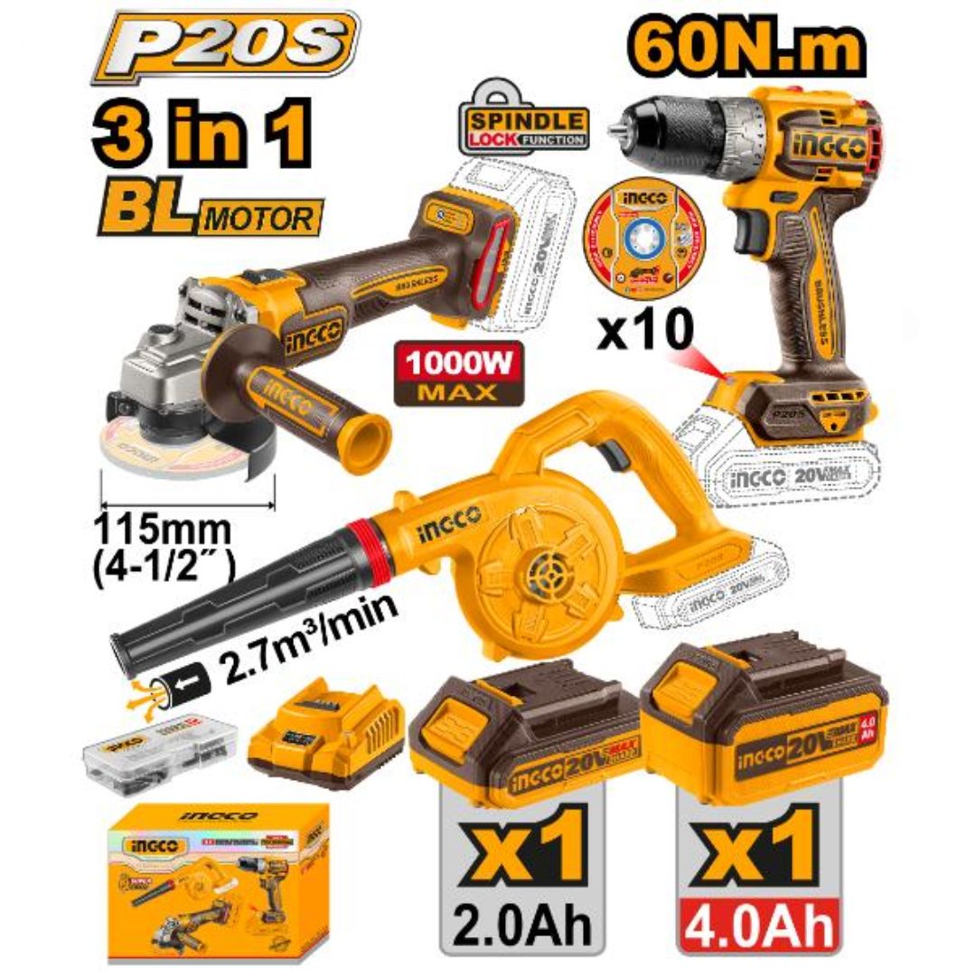 Le pack INGCO COSLI241192 est un ensemble sans fil 20 V idéal pour les bricoleurs et les professionnels recherchant polyvalence et performance. Il comprend trois outils brushless : une meuleuse angulaire de 115 mm, une perceuse/visseuse compacte et un souffleur, accompagnés de deux batteries, d’un chargeur et d’une sélection complète d’accessoires pour démarrer immédiatement vos travaux. Grâce à leur conception sans fil et à leurs moteurs brushless, ces outils offrent puissance, autonomie et durabilité, permettant de réaliser perçage, vissage, meulage, découpe ou nettoyage avec efficacité et confort. Ce kit complet est parfait pour l’atelier, le garage ou les petits chantiers.
