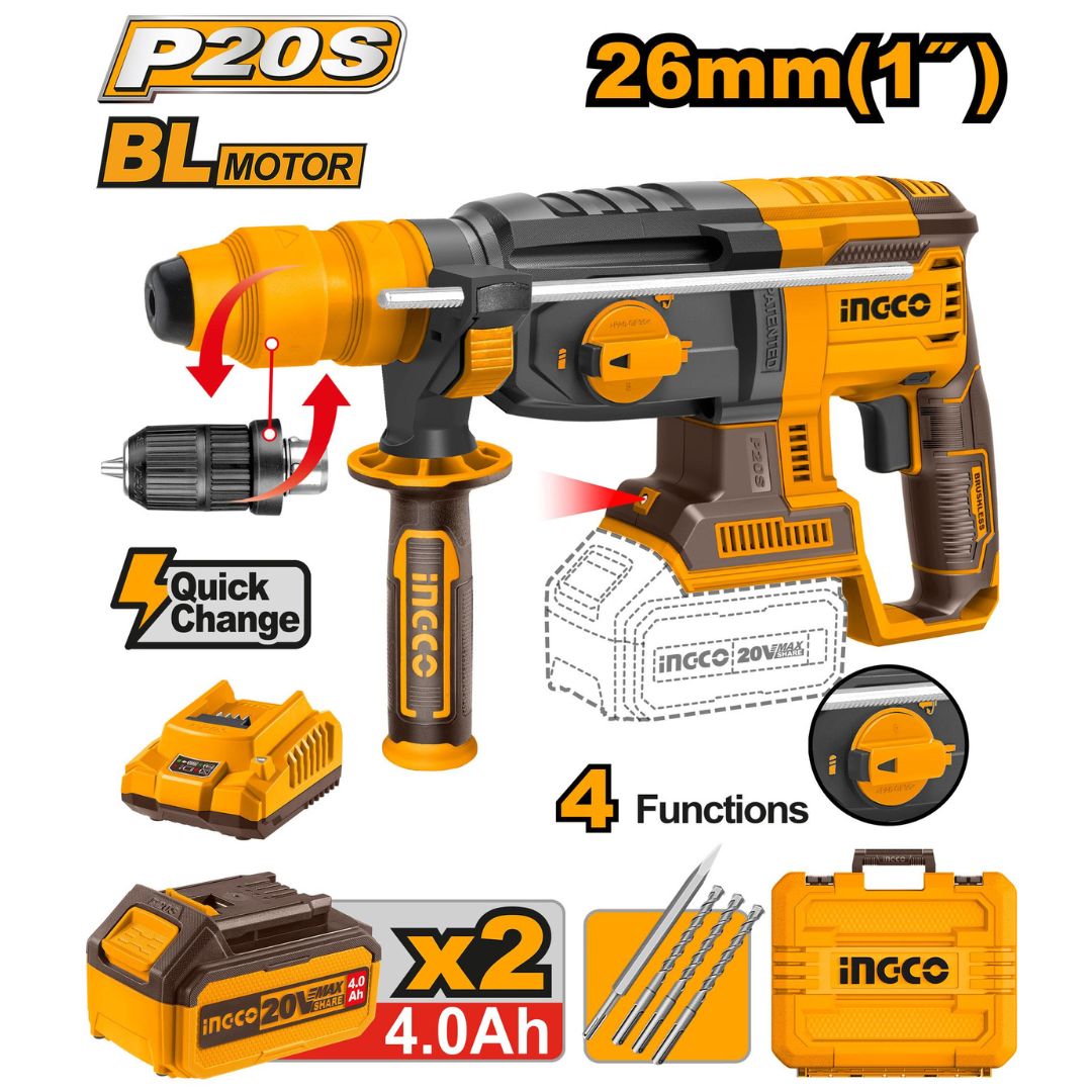Marteau perforateur26mm20V+2Batt 4Ah mandrin sans clé INGCO